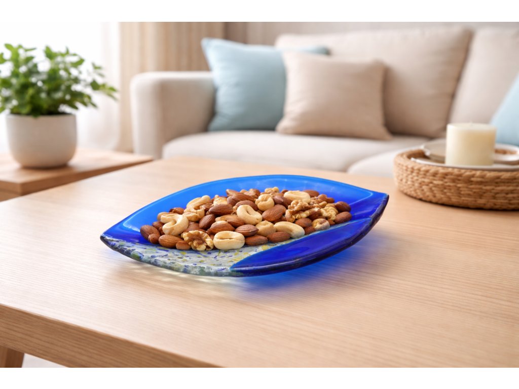 Průzračně modrá hladina moře a zrníčka písku na břehu, to je spojení rozdílných barev i struktur u této misky ve tvaru mandle.