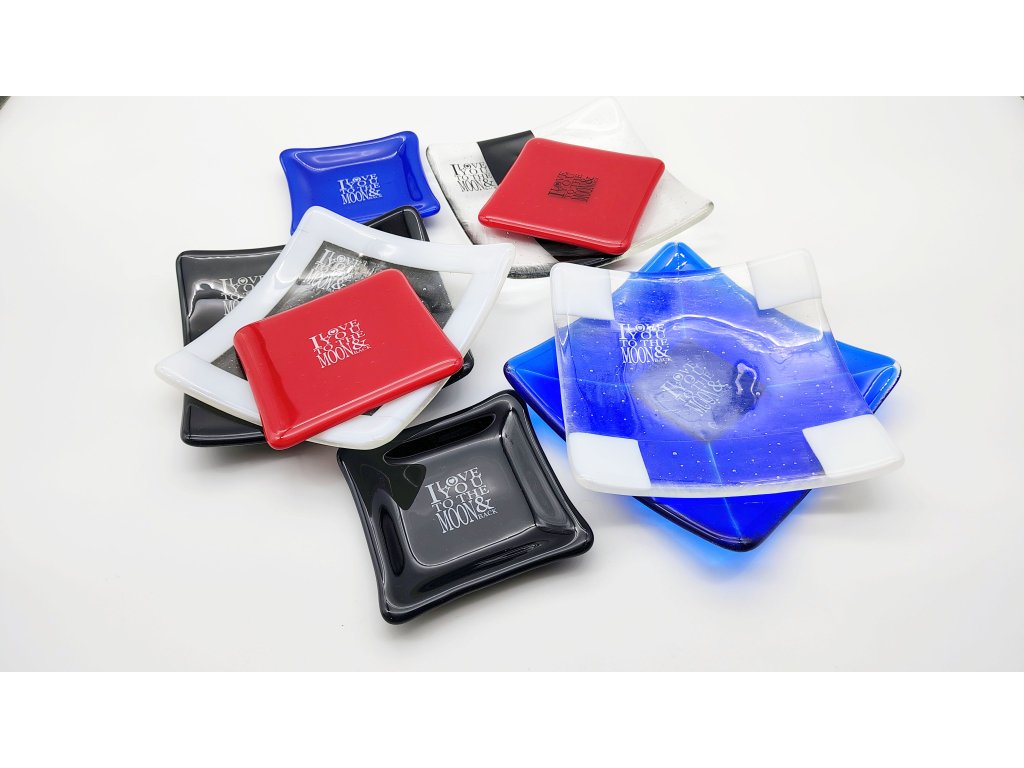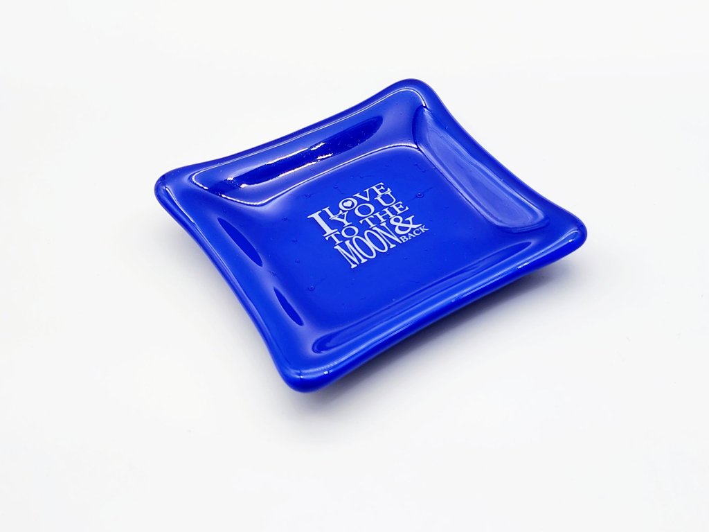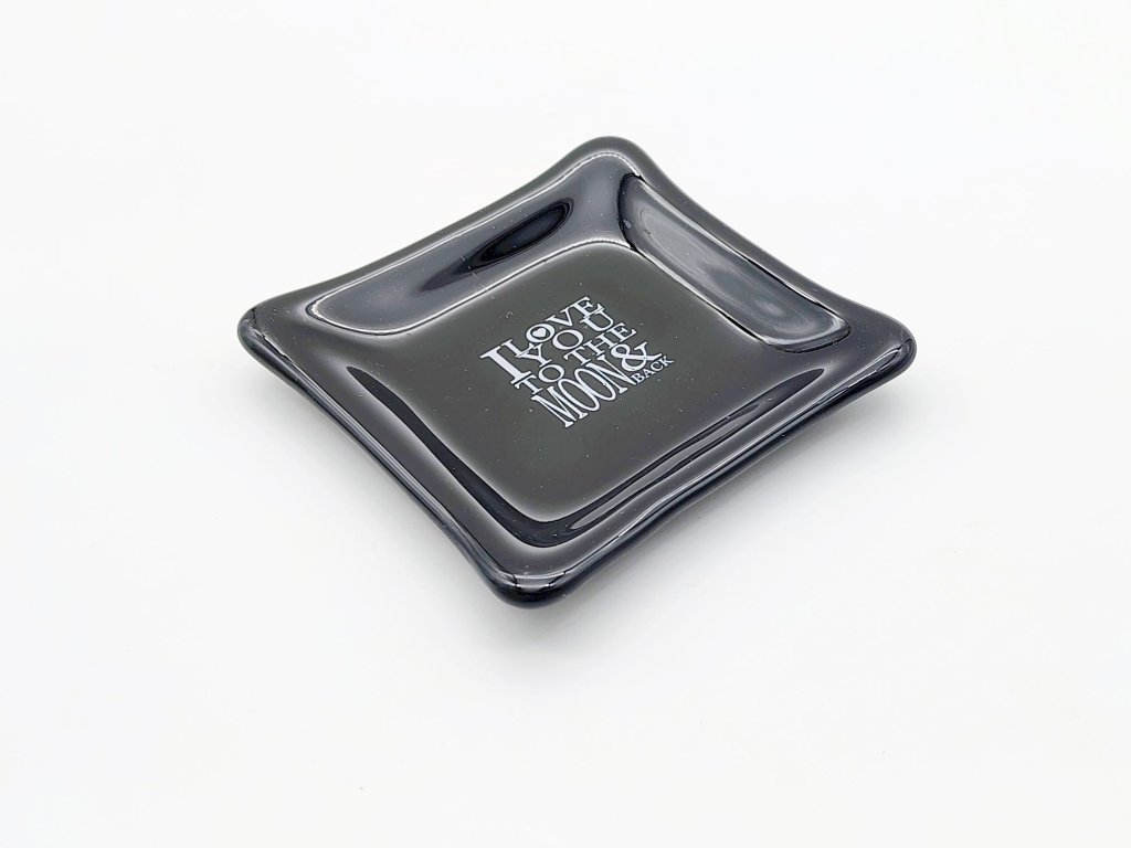 Miska je zdobena nápisem s vyznáním lásky - citátem "I love you to the moon and back". Nápis je tvořen speciálním obtiskem zataveným do skla. Rozměry misky cca 10x10 cm