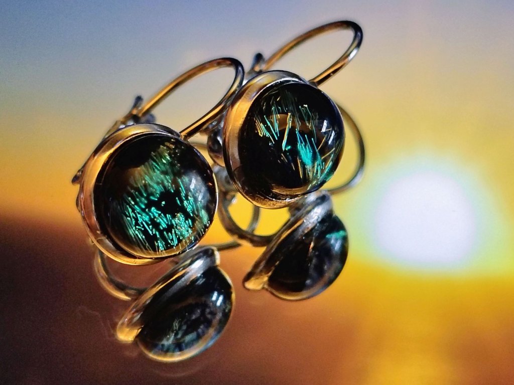 Střípky dichroického skla vytvářejí lesklou pavučinku v černém skle. Tajemné bludiště pro tajemnou ženu