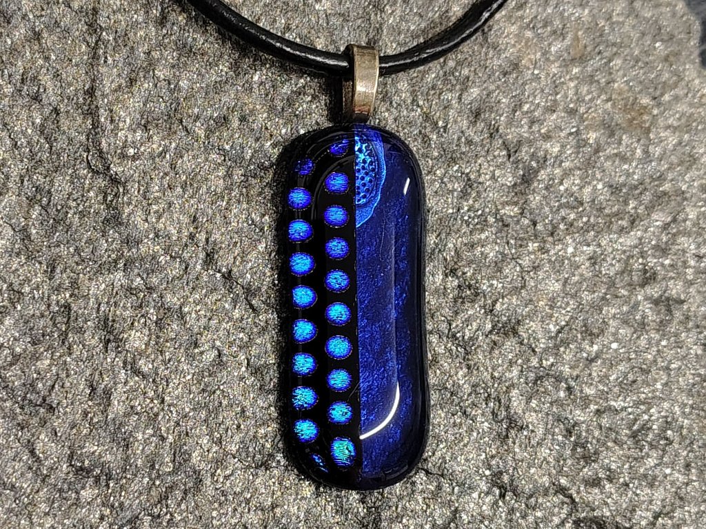 Hravé puntíky v blankytně modré barvě uživují decentní tmavě modrý přívěsek. Na první pohled decentní, puntíky zazáří v plné kráse při dopadu slunečních paprsků.