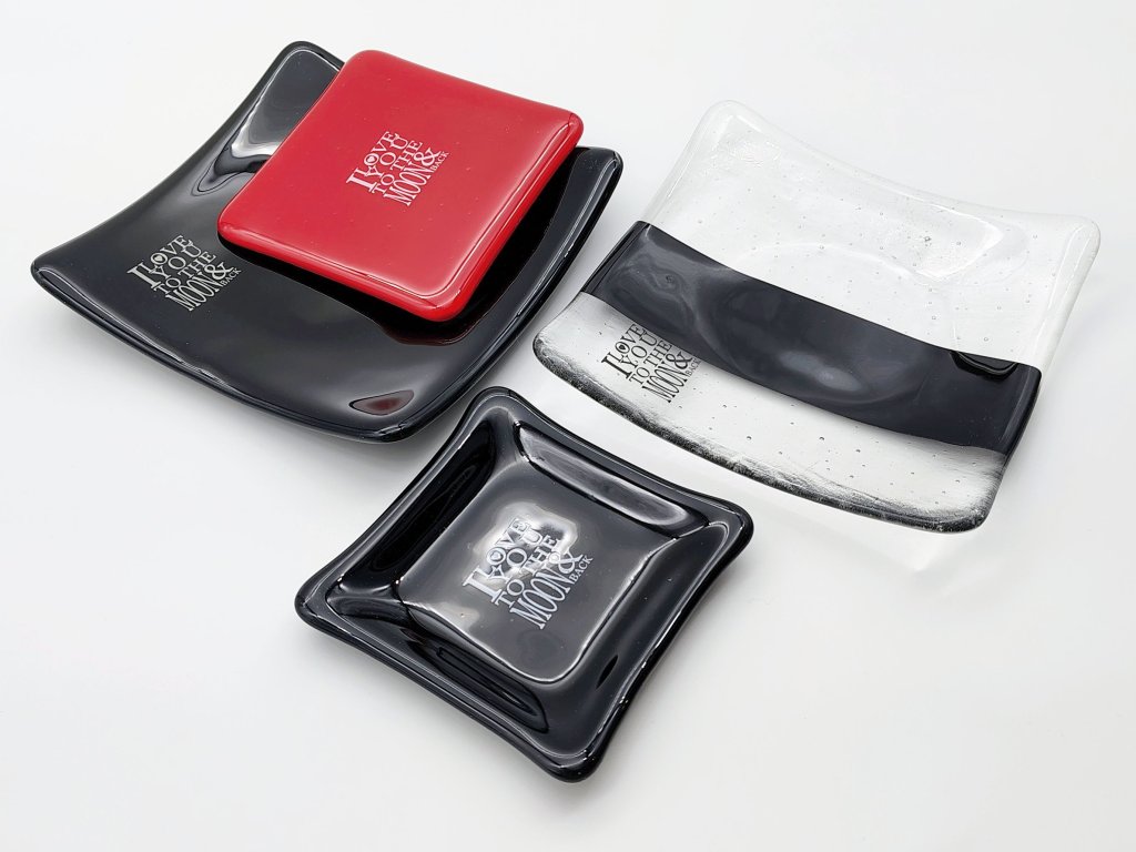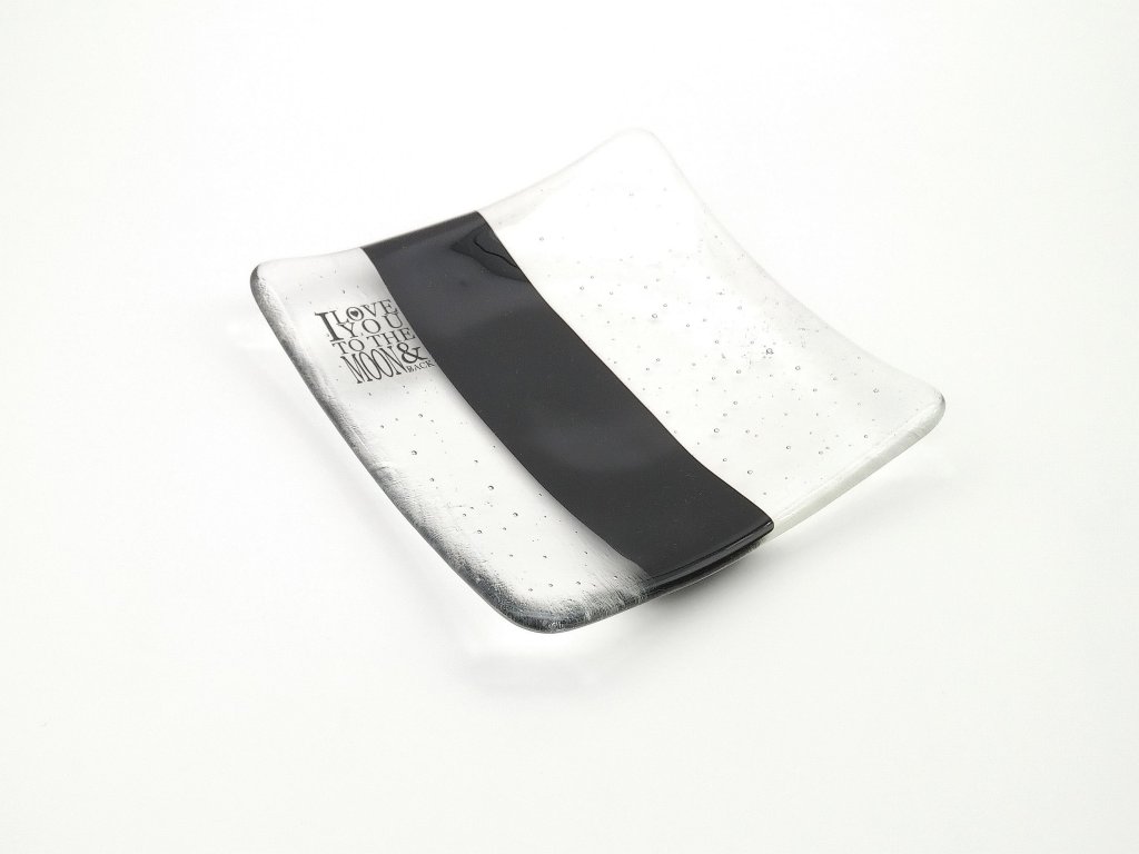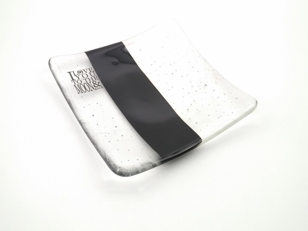 Talířek je zdoben nápisem s vyznáním lásky - citátem "I love you to the moon and back". Nápis je tvořen speciálním obtiskem zataveným do skla. Elegantní kombinace průsvitného skla a černé barvy vynikne v každém interiéru a můžete ho kombinovat s dalším nádobím z Valentýnské série